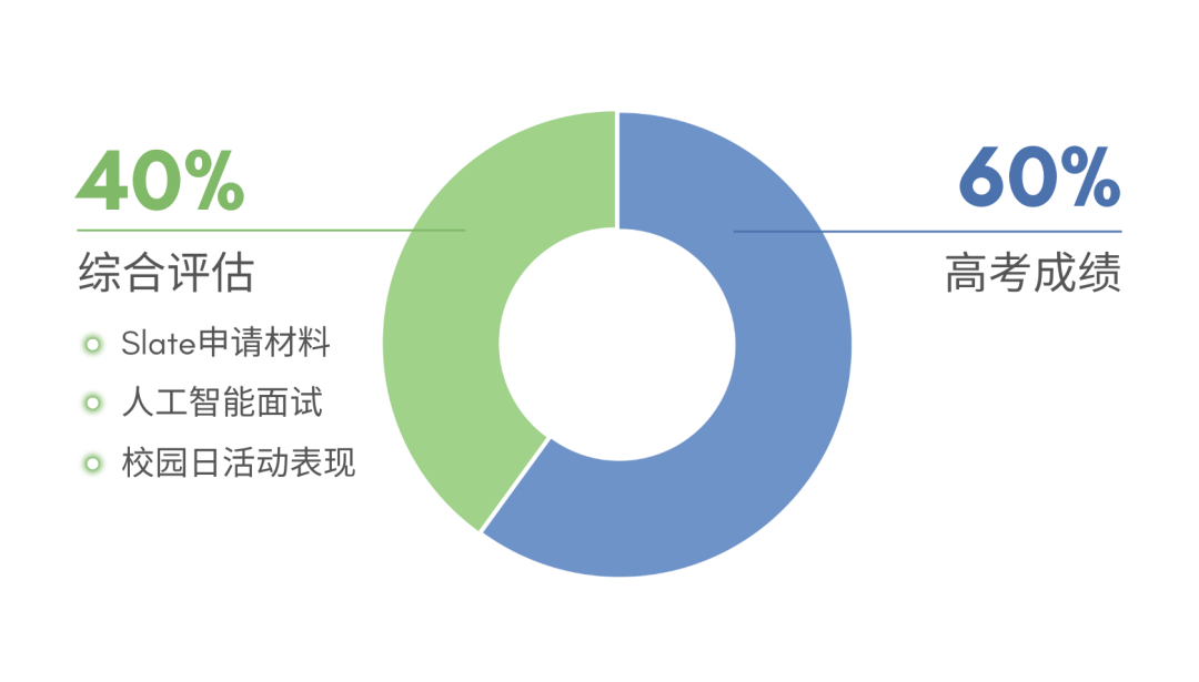 昆山杜克大学将综合评估申请者高考成绩 (权重60%)、以及学校自主综合评估成绩 (权重40%,包括对Slate入学申请材料和人工智能面试结果的评估以及申请者“校园日活动”表现),按照“6-4”模式进行综合评分,择优录取。